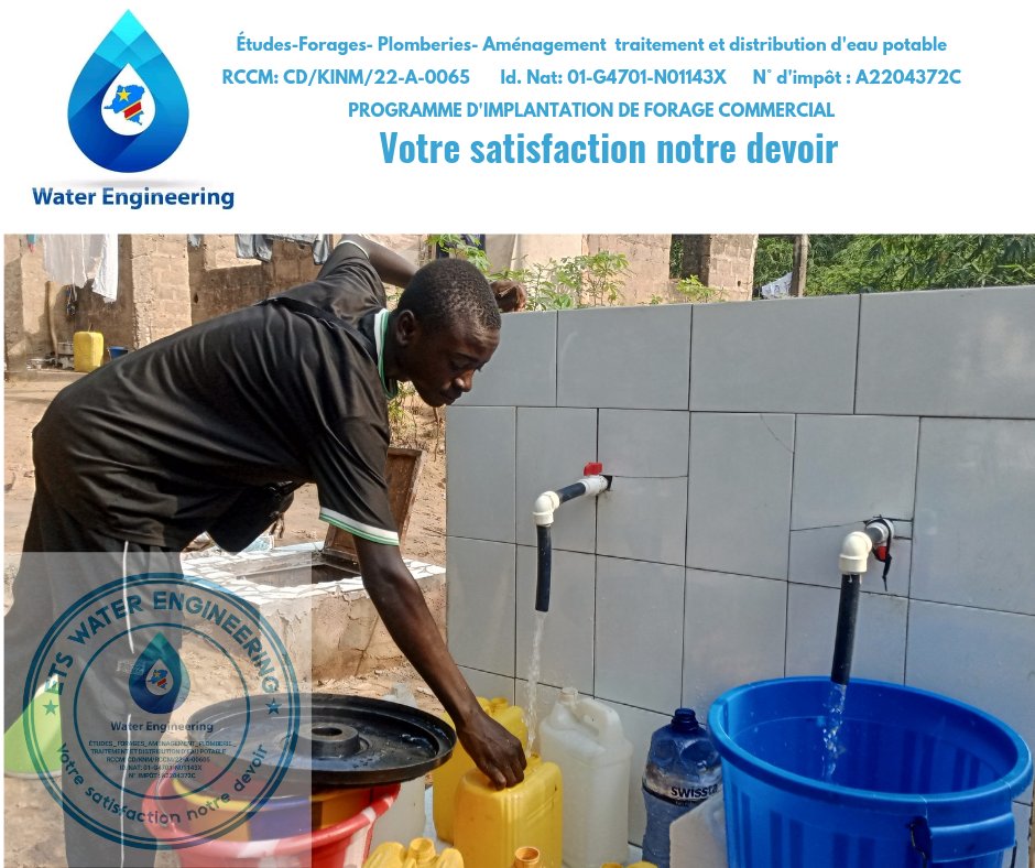 Il sied de signifier que Water Engineering est une entreprise d’ingénierie spécialisée dans l’étude et la réalisation de forage d’eau potable en RDC. Elle travaille avec toutes les personnes ayant besoin d’un ouvrage de forage privé, commercial ou communautaire. C’est dans le cadre de son programme d’implantation de forage commercial qui a pour objectif de résoudre le problème d’accès à l’eau potable pour la population en créant une nouvelle source des revenus.
